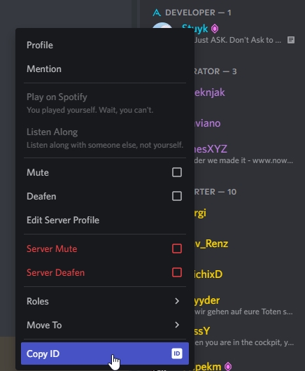 Then right-click on yourself in any server, channel, etc. and get your identifier.